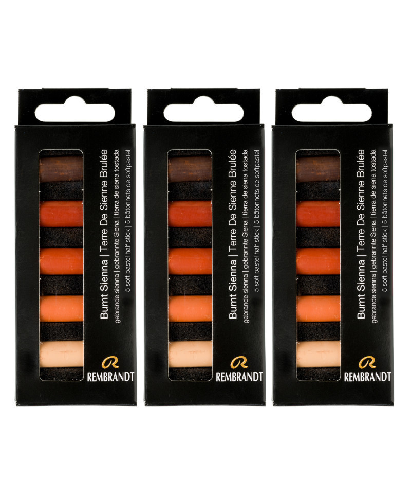 Rembrandt soft pastels are world renowned, professional-quality sticks that are manufactured with only the purest pigments and finest quality kaolin clay. They are made in The Netherlands under strict quality control standards. Each color is made with unique pigmentation formulas. These round sticks have excellent softness for beautiful color release and toning. Each set includes 5 half pastels (411,3 - 411,5 - 411,7 - 411,8 - 411,9). Sold as 3 sets for a total of 15 half pastels.