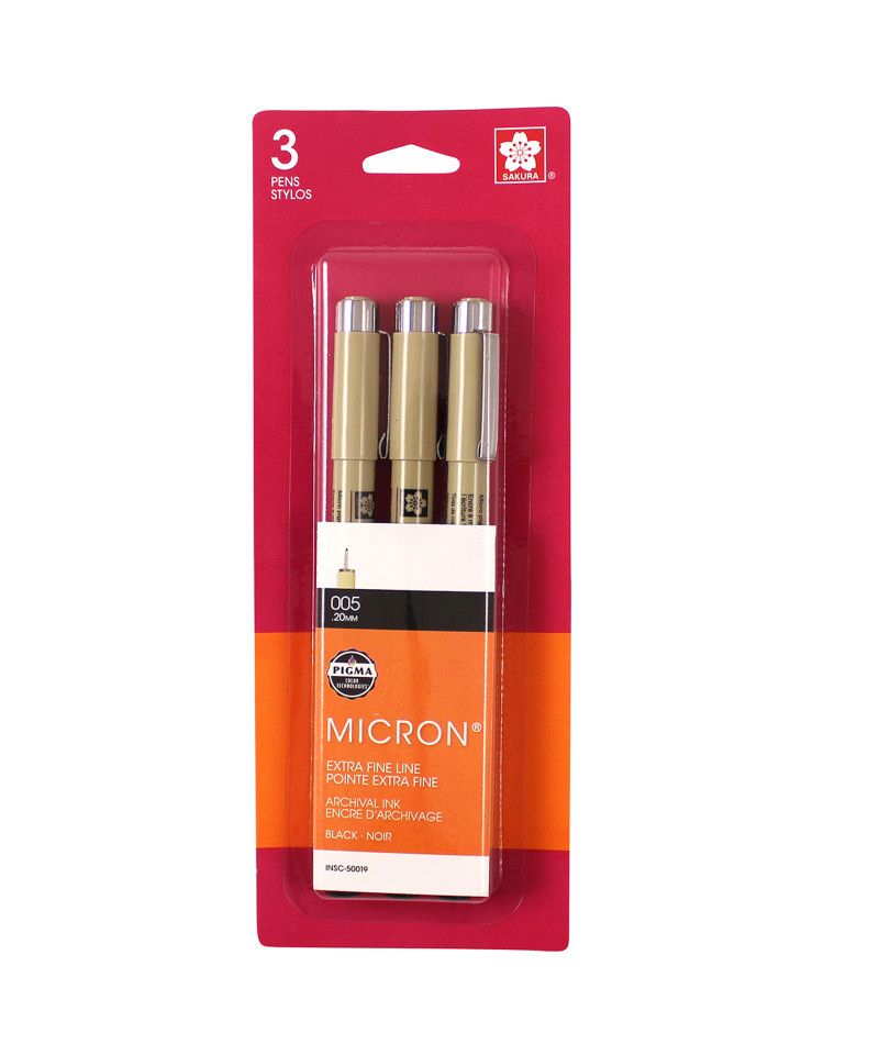Pigma Micron pens are waterproof and permanent fineliners that are loyally used by designers, scientists, archivists, architects, Manga artists, cartoonists, illustrators and hobbyists. The fine nib makes this pen ideal for creating both technical and artistic drawings. The fineliners have a protective metal sleeve around the extended tip to give extra control and increased resilience when used with drawing aids such as rulers. This permanent, fade resistant, chemically stable, pigment-based ink will not bleed or run if liquids are spilled on or applied to the document after the ink has dried. Perfect for legal situations, Pigma ink is nearly impossible to alter on documents, in log books, or on checks. Architects, archivists, anthropologists, entomologists and laboratories depend on Pigma Micron for record keeping. Pigma Micron is the first disposable technical pen using archival pigmented ink. It does not smear, feather, or bleed through on most paper. Contains three size 005 pens.