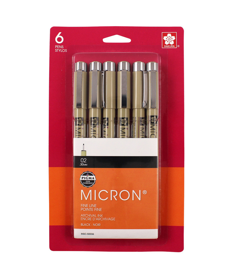 Pigma Micron pens are waterproof and permanent fineliners that are loyally used by designers, scientists, archivists, architects, Manga artists, cartoonists, illustrators and hobbyists. The fine nib makes this pen ideal for creating both technical and artistic drawings. The fineliners have a protective metal sleeve around the extended tip to give extra control and increased resilience when used with drawing aids such as rulers. This permanent, fade resistant, chemically stable, pigment-based ink will not bleed or run if liquids are spilled on or applied to the document after the ink has dried. Perfect for legal situations, Pigma ink is nearly impossible to alter on documents, in log books, or on checks. Architects, archivists, anthropologists, entomologists and laboratories depend on Pigma Micron for record keeping. Pigma Micron is the first disposable technical pen using archival pigmented ink. It does not smear, feather, or bleed through on most paper. Contains six size 02 pens.