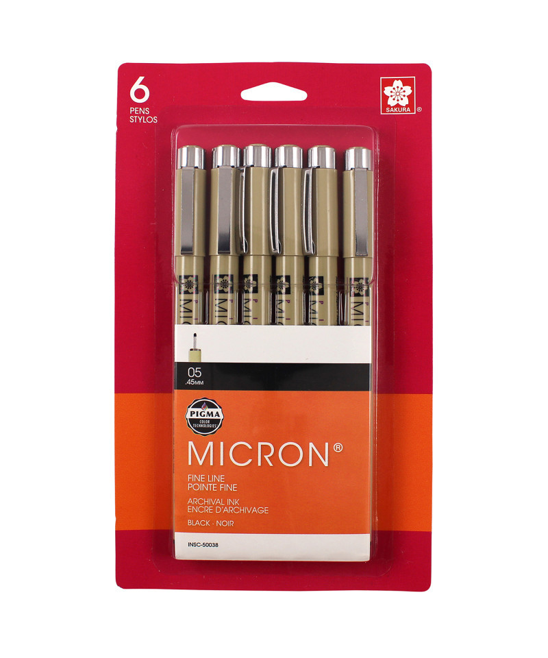 Pigma Micron pens are waterproof and permanent fineliners that are loyally used by designers, scientists, archivists, architects, Manga artists, cartoonists, illustrators and hobbyists. The fine nib makes this pen ideal for creating both technical and artistic drawings. The fineliners have a protective metal sleeve around the extended tip to give extra control and increased resilience when used with drawing aids such as rulers. This permanent, fade resistant, chemically stable, pigment-based ink will not bleed or run if liquids are spilled on or applied to the document after the ink has dried. Perfect for legal situations, Pigma ink is nearly impossible to alter on documents, in log books, or on checks. Architects, archivists, anthropologists, entomologists and laboratories depend on Pigma Micron for record keeping. Pigma Micron is the first disposable technical pen using archival pigmented ink. It does not smear, feather, or bleed through on most paper. Contains six size 05 pens.