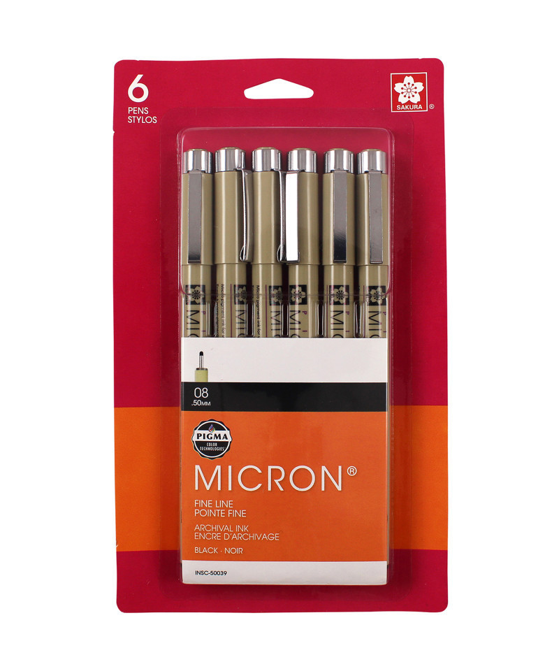 Pigma Micron pens are waterproof and permanent fineliners that are loyally used by designers, scientists, archivists, architects, Manga artists, cartoonists, illustrators and hobbyists. The fine nib makes this pen ideal for creating both technical and artistic drawings. The fineliners have a protective metal sleeve around the extended tip to give extra control and increased resilience when used with drawing aids such as rulers. This permanent, fade resistant, chemically stable, pigment-based ink will not bleed or run if liquids are spilled on or applied to the document after the ink has dried. Perfect for legal situations, Pigma ink is nearly impossible to alter on documents, in log books, or on checks. Architects, archivists, anthropologists, entomologists and laboratories depend on Pigma Micron for record keeping. Pigma Micron is the first disposable technical pen using archival pigmented ink. It does not smear, feather, or bleed through on most paper. Contains six size 08 pens.