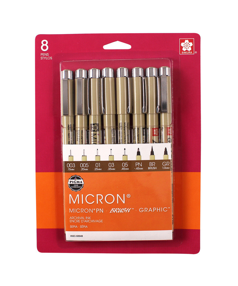 Pigma Micron pens are waterproof and permanent fineliners that are loyally used by designers, scientists, archivists, architects, Manga artists, cartoonists, illustrators and hobbyists. The fine nib makes this pen ideal for creating both technical and artistic drawings. The fineliners have a protective metal sleeve around the extended tip to give extra control and increased resilience when used with drawing aids such as rulers. This permanent, fade resistant, chemically stable, pigment-based ink will not bleed or run if liquids are spilled on or applied to the document after the ink has dried. Perfect for legal situations, Pigma ink is nearly impossible to alter on documents, in log books, or on checks. Architects, archivists, anthropologists, entomologists and laboratories depend on Pigma Micron for record keeping. Pigma Micron is the first disposable technical pen using archival pigmented ink. It does not smear, feather, or bleed through on most paper. Contains sizes 005, 01, 02, 03, 05, 08, 1mm and Brush.