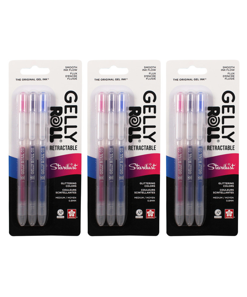 Stunning Gelly Roll Stardust® captures the sparkle and glitter of stars to create unique effects in your art or handwriting. Use it for highlighting or special details. Stardust Clear offers crystal clear gel ink blended with glitter to allow pure sparkle writing and embellishment. For the best results, use Stardust® gel ink on light colored or matte paper surfaces. Each pack includes 3 pens in assorted colors: Rose, Purple and Blue. Sold as 3 sets for a total of 9 pens.