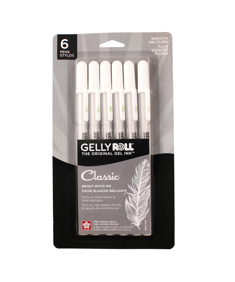 Sakura Retractable Gelly Roll Pens: The original gel ink, reimagined in retractable, so you can infuse fun, sparkle, and shine into work, art, and play; great as bullet journal pens. The opaque white ink stands out on dark and colored papers and makes highlights pop in illustrations and comics. Use it for hand lettering accents, party crafts, layered on top of colors for mixed media and bright highlights in tonal drawings. This white pen pack contains 6 pens, including 2 pens of each size: 05 Fine, 08 Medium, and 10 Bold point sizes.