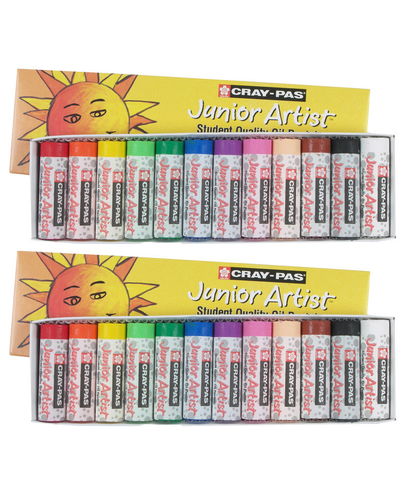 Invented in 1921, Sakura is the original inventor of oil pastels. Cray-Pas Junior Artist provides beautiful and blendable color for young hands. The best art curriculums nationwide use Cray-Pas to teach and practice art introductory techniques. Cray-Pas oil pastels can create oil paint effects, will not peel, crack or flake, are easily blendable, and are safe for children. The round shape of Cray-Pas Junior Artist is easy to hold, and are great for drawing, lettering, scratch art, and long lasting sidewalk art. Cray-Pas are excellent on paper, cardboard, and canvas. Pastels measure 18mm x 60mm. Each set includes 12 oil pastels in assorted colors. Sold as 2 sets for a total of 24 oil pastels.