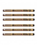Pigma Micron pens are waterproof and permanent fineliners that are loyally used by designers, scientists, archivists, architects, Manga artists, cartoonists, illustrators and hobbyists. The fine nib makes this pen ideal for creating both technical and artistic drawings. The fineliners have a protective metal sleeve around the extended tip to give extra control and increased resilience when used with drawing aids such as rulers. This permanent, fade resistant, chemically stable, pigment-based ink will not bleed or run if liquids are spilled on or applied to the document after the ink has dried. Perfect for legal situations, Pigma ink is nearly impossible to alter on documents, in log books, or on checks. Architects, archivists, anthropologists, entomologists and laboratories depend on Pigma Micron for record keeping. Pigma Micron is the first disposable technical pen using archival pigmented ink. It does not smear, feather, or bleed through on most paper. Sold as a pack of 6. Specifications: Working temp.: 5˚C - 40˚C Ink type: Water-based pigment ink Size: 135 mm