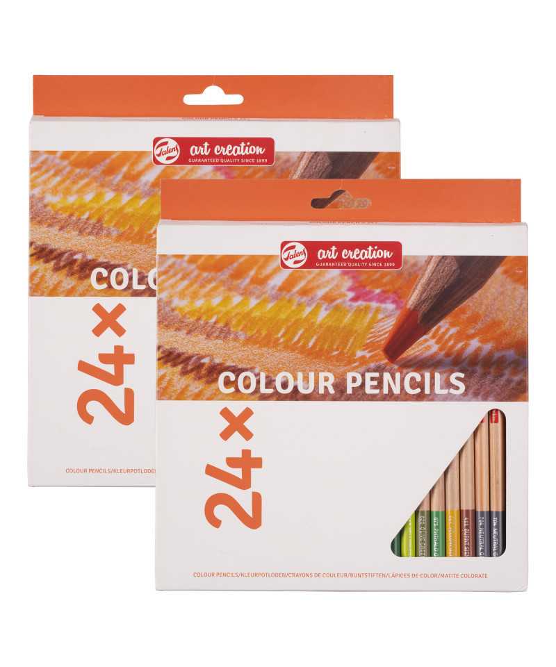 This set of colored pencils offers you a great selection of colors to create various drawings with. Each set includes 24 pencils (105 Titanium White – 224 Naples Yellow Red – 275 Primary Yellow – 270 Azo Yellow Deep – 276 Azo Orange – 311 Vermilion – 334 Scarlet – 357 Rose – 545 Red Violet – 376 Purper – 548 Blue Violet – 504 Ultramarine – 564 Brilliant Blue – 660 Turquoise Green Light – 615 Emerald Green – 675 Phthalo Green – 617 Yellow Green – 674 Phthalo Green Deep – 620 Olive Green – 227 Yellow Ochre – 411 Burnt Sienna – 403 Vandyke Brown – 704 Neutral Gray – 701 Ivory Black). Talens Art Creation colored pencil sets offer a balanced range of colors, all made from high-quality pigments that provide excellent color transfer and are durable in use.