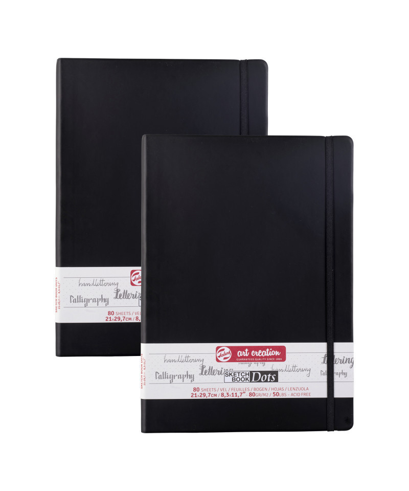 The dotted sheets of these sketchbooks are a wonderful compromise between blank and ruled or gridded sheets; they offer you a guide without taking attention away from what you create. With these evenly spaced dots, you can experience the insurance of lines and the freedom of a blank page in one sketchbook! Use these books for anything you want: taking notes, planning, drawing diagrams, mind maps, sketching, bullet journaling, lettering, calligraphy, you name it! They are suitable for pencil and ink and come in a variety of sizes. Talens Art Creation dotted sketchbooks contain 80 cream-colored, dotted sheets of 80 g/m², feature a soft, stylish black cover and include a ribbon bookmark and elastic closure band. Sold as a pack of 2.