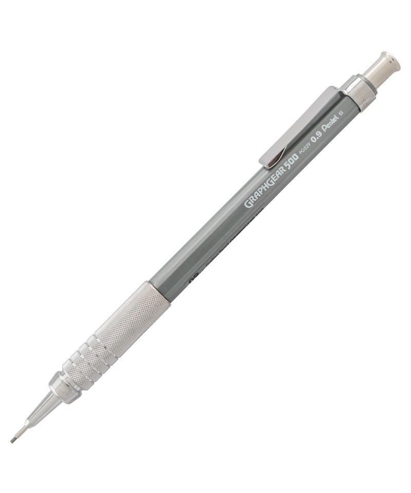 Introducing the GraphGear 500, a high-quality mechanical pencil designed for precision and durability. This pencil features a 4mm tip, making it perfect for use with rulers and templates. It comes pre-loaded with Pentel® Super Hi-Polymer® HB lead, which is renowned for its strength and clarity. This lead never requires sharpening and produces a clear, dark line for easy visibility. The GraphGear 500 also includes a dual-action retractor to protect the lead and a built-in lead hardness indicator for your convenience. The metallic grip, adorned with soft, latex-free pads, ensures comfort and control when writing. This pencil is weighted at your fingertips for precise drafting and template work. Available in 0.3mm, 0.5mm, 0.7mm, and 0.9mm sizes, each size is color-coded for quick identification. The GraphGear 500 also comes with a cap to keep your eraser clean.
