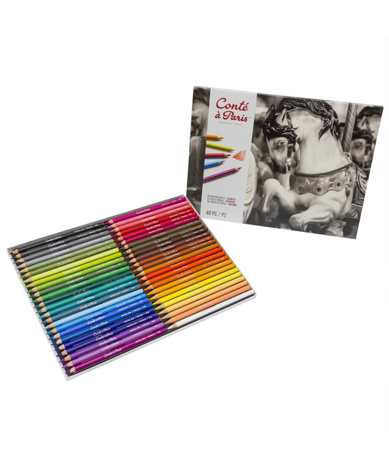 The Conté à Paris Pastel Pencil Set of 48 offers the rich texture and expressive range of traditional soft pastel in a cleaner, more controlled pencil form. Its exceptional 5mm diameter lead provides genuine freedom of creation and an unmatched tactile feel. Slightly harder and less pigmented than soft pastels, it’s perfect for fine detail work and smaller formats. These pastel pencils are ideal companions to Conté’s soft pastels and crayons, delivering precise lines and smooth blending without the mess. For best results, apply pure colors side by side rather than layering, preserving the vibrancy and depth of each hue.