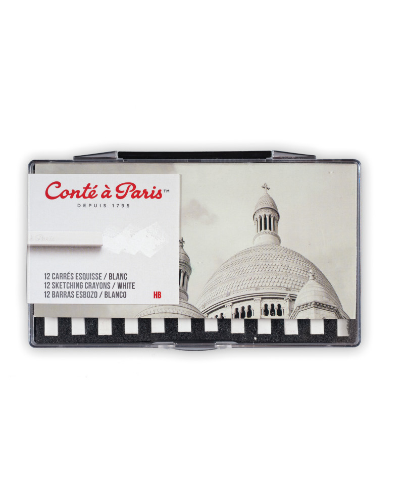 Create expressive, precise sketches with Conté à Paris Carrés Esquisse Sketching Pastel Crayons, White HB, Set of 12. These square sketching crayons feature a slightly softer lead than Conté pencils, allowing smooth, even coverage for both detailed and tonal work. The White HB variation is perfect for light accents, highlights, or drawing on toned and black papers for striking contrast. Ideal for preliminary sketches, mixed-media studies, or finished monochromatic compositions, these crayons blend easily with other colors to adjust values or refine highlights. The HB grade offers the perfect balance between hardness and softness for controlled, responsive mark-making.