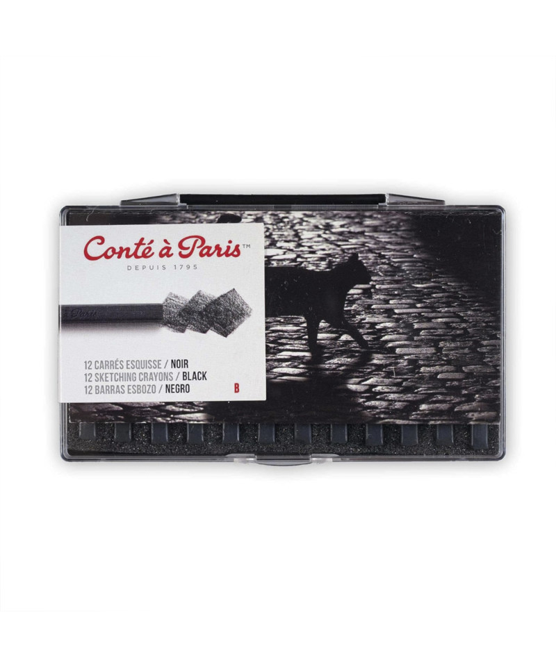 Achieve expressive depth and contrast with Conté à Paris Carrés Esquisse Sketching Pastel Crayons, Black B, Set of 12. Each square crayon features a smooth, slightly softer core than Conté pencils, ideal for building tonal values and bold, dramatic sketches. The Black B variation provides rich, velvety coverage perfect for shading, outlining, and defining form on paper or toned surfaces. Excellent for studies, figure drawing, and mixed-media layering, these crayons blend effortlessly with White, Red, and Bistre Conté tones. The B grade offers soft laydown for controlled linework, subtle gradients, and expressive mark-making in professional and academic art settings.
