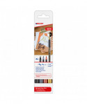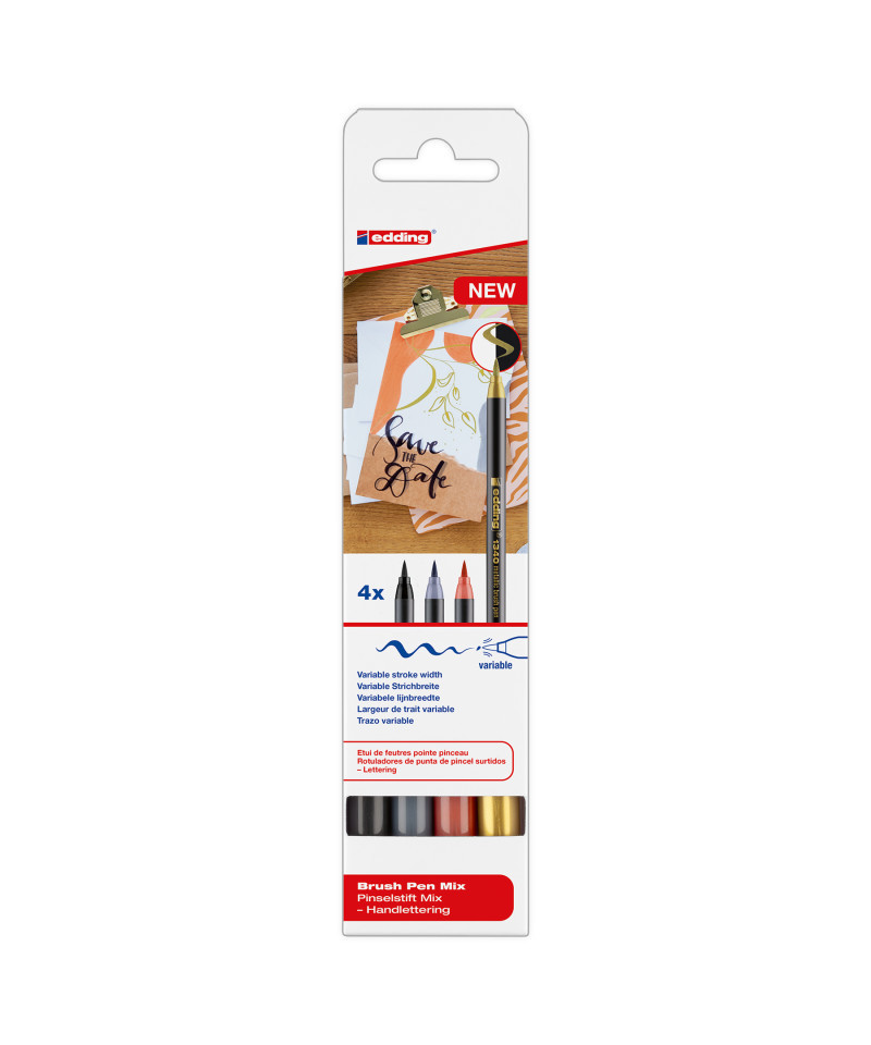 Create eye-catching designs with edding 1340 Series Metallic Brush Pens, Assorted Colors, Set of 4. Featuring flexible brush tips and rich metallic ink, these high-quality pens deliver shimmering color and expressive linework on both light and dark paper. Perfect for hand lettering, journaling, card making, and decorative projects, the pens require no shaking or pumping, just smooth, consistent ink flow. The water-based pigment formula dries quickly for smudge-free results and minimal odor. This set includes six dazzling metallic shades ideal for creative artwork and festive crafts. Designed for artists, students, and crafters alike, edding metallic brush pens combine brilliance, control, and long-lasting performance for professional-quality results.