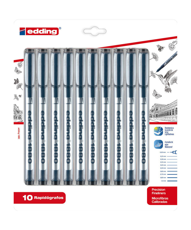 Achieve precise, professional linework with edding 1880 Series Drawliner Pens, Assorted Sizes, Black, Set of 10. Designed for technical drawing, illustration, and fine-detail work, these pens feature durable metal-encased fiber tips that deliver consistent, clean lines with every stroke. The water-based pigment ink is waterproof, lightfast, and smudge-resistant once dry, ideal for use with rulers, stencils, or over light watercolor washes. The set includes ten assorted nib sizes, ranging from ultra-fine to bold, providing maximum control for sketching, drafting, and design. Perfect for artists, architects, and students, edding drawliners combine precision engineering with reliable ink flow for crisp, archival-quality results in every creative or professional project.