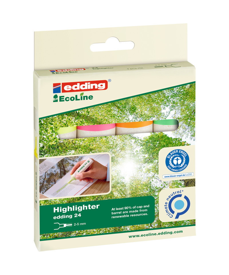 Highlight sustainably with edding 24 Series EcoLine Highlighters, Assorted Colors, Set of 4. Made from at least 90% renewable resources, these eco-friendly markers combine vibrant performance with environmental responsibility. Each highlighter features a chisel tip for variable line widths and precise marking, making it ideal for study notes, textbooks, and office use. The water-based neon ink provides bright, consistent color that won’t bleed through most papers. The set includes four essential shades, yellow, pink, orange, and green, designed for clear, eye-catching emphasis. Perfect for students, teachers, and professionals, edding EcoLine highlighters deliver reliable quality and smooth application while supporting sustainable practices for a cleaner planet.