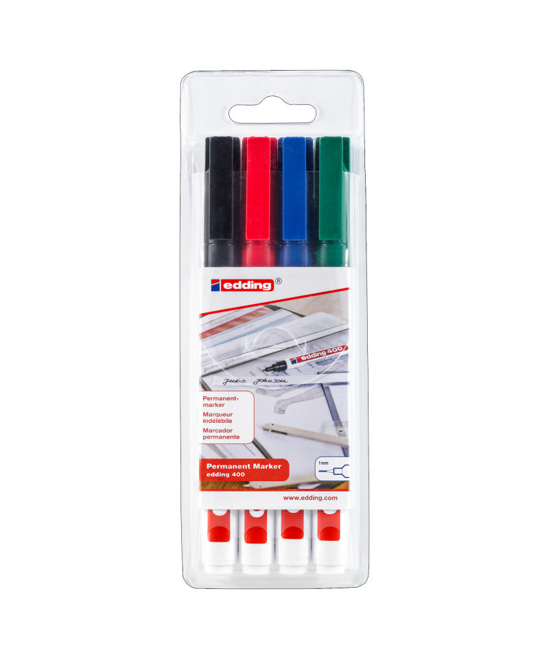 Experience dependable, professional-quality marking with edding 400 Series Permanent Markers, Assorted Colors, Set of 4. Designed for precision and durability, these markers feature fine bullet tips and quick-drying, waterproof ink that adheres permanently to most surfaces, including plastic, glass, metal, and wood. The low-odor ink delivers bold, fade-resistant color that resists smudging and wear, making it ideal for classrooms, offices, and studios. The set includes four essential colors, black, red, blue, and green, perfect for labeling, drawing, and detailed writing. Compact and reliable, edding 400 Series markers offer smooth ink flow and consistent performance trusted by professionals, educators, and artists worldwide for clean, long-lasting results on nearly any surface.
