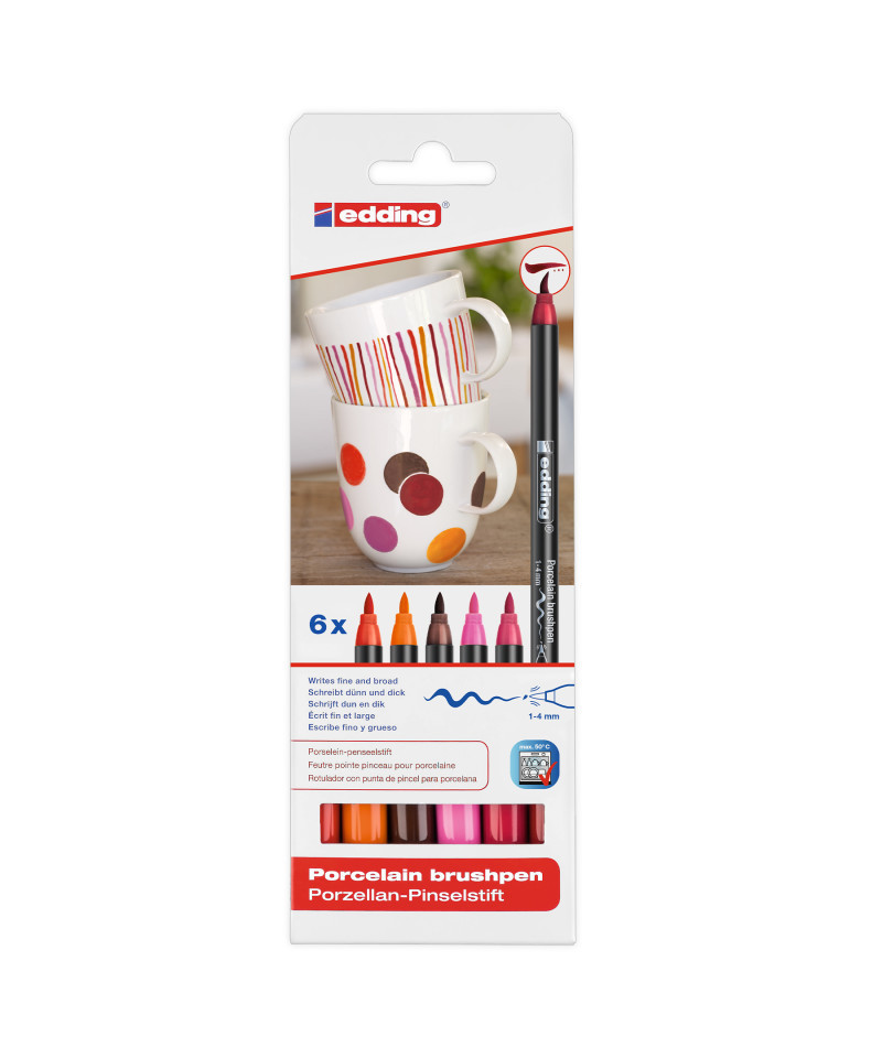 Bring warmth and vibrancy to your ceramic and glass creations with edding 4200 Series Porcelain Brush Pens, Warm Colors, Set of 6. These high-quality brush pens feature flexible fiber tips that make it easy to create fine details, bold strokes, and smooth fills. The water-based pigment ink offers rich, opaque coverage on glazed ceramics, porcelain, and glass, and becomes dishwasher-safe after heat fixing in a conventional oven. The warm color palette includes reds, yellows, and complementary tones ideal for cheerful, inviting designs. Low-odor and easy to use, these pens are perfect for classrooms, craft studios, and home DIY projects. edding 4200 Series pens combine professional-quality results with effortless creative freedom.