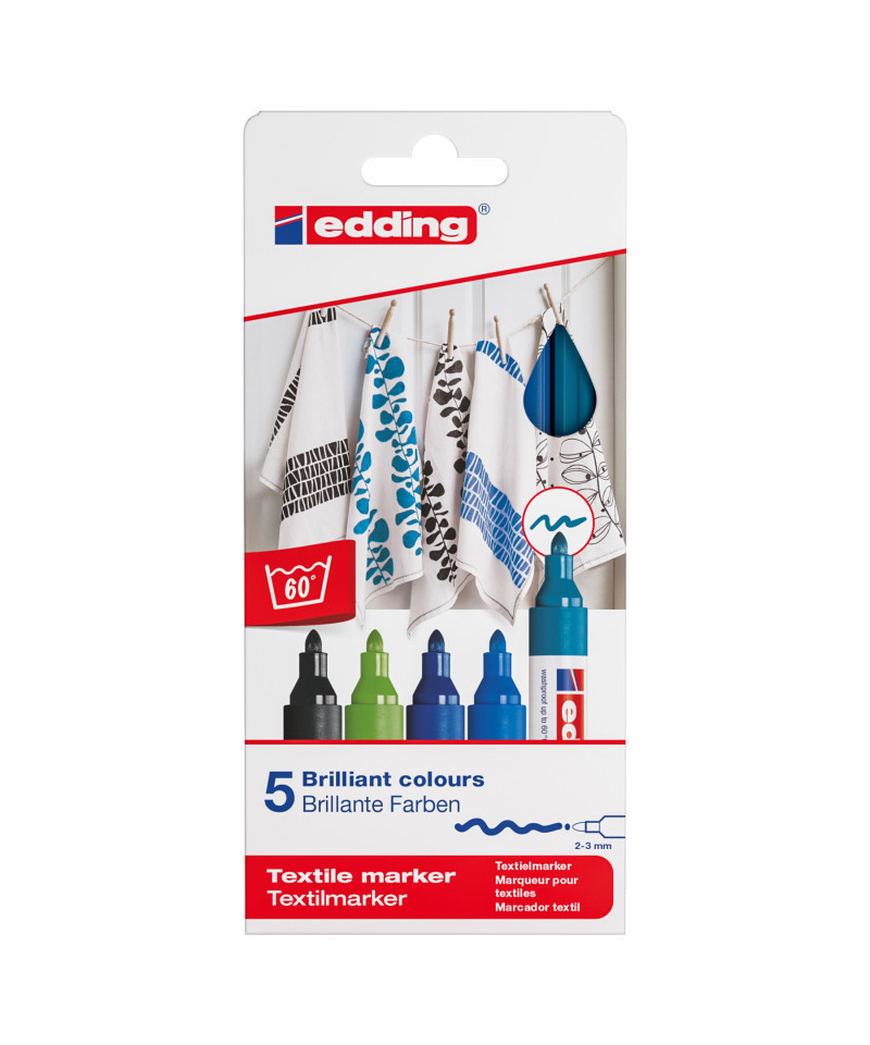 Add fresh, vibrant hues to your fabric projects with edding 4500 Series Textile Markers, Cool Colors, Set of 5. Designed for precision and performance, these fine bullet-tip markers provide smooth, even color application on cotton, linen, and most untreated light fabrics. The water-based pigment ink is odorless, quick-drying, and becomes permanent once heat-set with an iron, remaining washable up to 140°F (60°C). The cool-toned palette includes blues, greens, and complementary shades perfect for modern designs, custom apparel, and home décor. Ideal for classrooms, craft studios, and hobby artists, edding 4500 Series markers make it easy to personalize fabric projects with professional-quality color that lasts wash after wash.