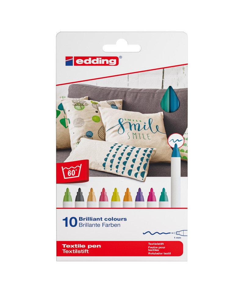Bring your fabric designs to life with edding 4600 Series Textile Pens, Fun Colors, Set of 10. These premium fabric pens feature fine fiber tips for smooth, detailed drawing, writing, and outlining on cotton, linen, and most untreated light fabrics. The water-based pigment ink glides effortlessly and becomes permanent after heat fixing with an iron, staying vibrant through washes up to 140 °F (60 °C). The cheerful, fun color selection is perfect for personalizing T-shirts, tote bags, and creative textile projects. Low-odor and easy to use, these pens are ideal for students, teachers, and crafters. edding 4600 Series textile pens combine brilliant, long-lasting color with precision control for professional-quality results on every fabric surface.