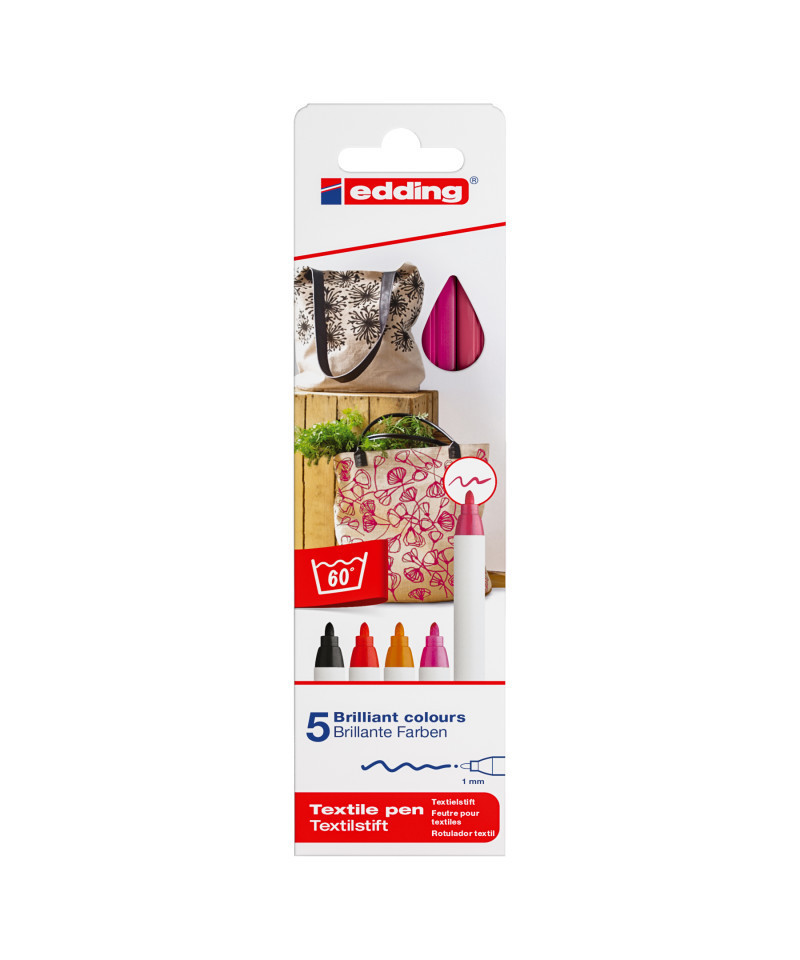 Infuse your fabric art with rich, inviting tones using edding 4600 Series Textile Pens, Warm Colors, Set of 5. These fine fiber-tip pens provide smooth, precise application on cotton, linen, and most untreated light fabrics. The water-based pigment ink flows evenly for bright, consistent color and becomes permanent after heat fixing with an iron, remaining wash-resistant up to 140 °F (60 °C). The warm color palette includes reds, oranges, yellows, and complementary hues ideal for bold, expressive designs. Perfect for classrooms, craft studios, or home use, edding 4600 Series textile pens combine precision, creativity, and lasting color performance for professional-quality fabric customization that endures wash after wash.