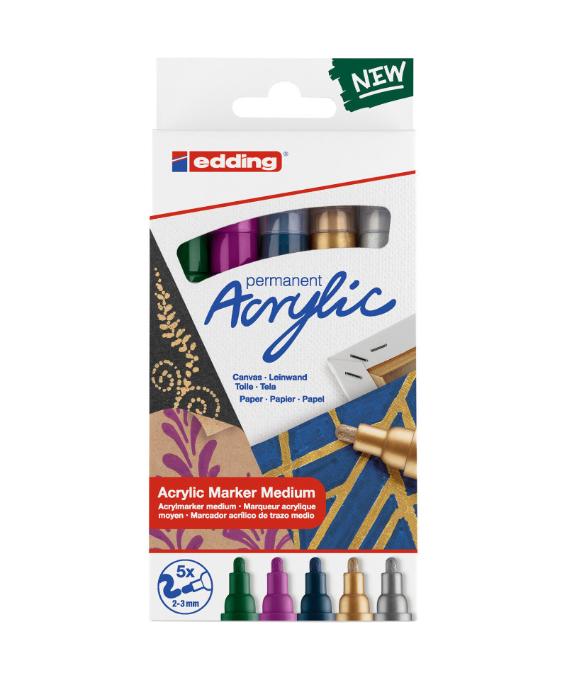 Celebrate creativity year-round with edding 5100 Series Acrylic Paint Markers, Medium Tip, Festive Colors, Set of 5. Designed for precision and performance, these medium bullet-tip markers provide smooth, even color application on canvas, wood, paper, stone, and metal. The highly pigmented, water-based acrylic ink produces brilliant, opaque color with a matte finish that resists fading and smudging. The festive 5-color palette includes metallic-inspired and vibrant seasonal hues perfect for holiday crafts, signage, and decorative artwork. Ideal for classrooms, studios, and creative professionals, edding 5100 Series markers offer consistent ink flow, quick-drying performance, and lasting durability—bringing a joyful sparkle and professional-quality finish to every artistic project.