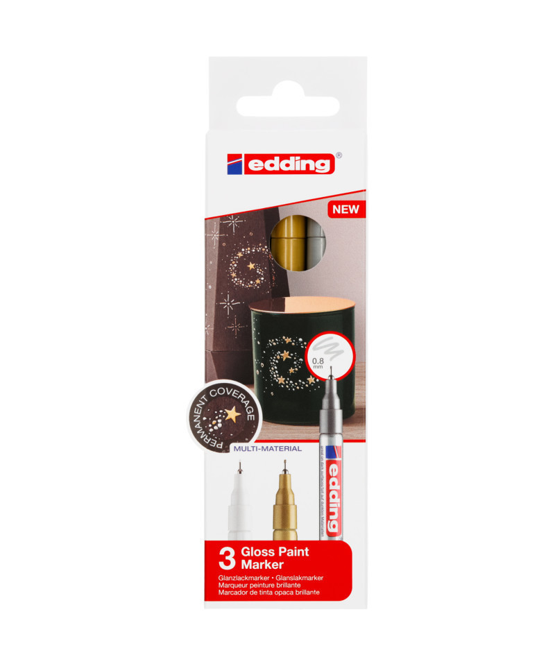 Achieve precise, shimmering detail with edding 780 Series Gloss Paint Markers, Metallic Colors, Set of 3. These ultra-fine paint markers feature a 0.8 mm round tip for controlled, detailed writing and line work on almost any surface. The highly opaque, oil-based pigment ink delivers a brilliant, glossy finish that’s both waterproof and heat-resistant, ensuring long-lasting color indoors or outdoors. Perfect for fine art, crafts, and professional labeling, the metallic color set includes gold, silver, and copper for elegant, eye-catching effects. The ink dries quickly, resists fading, and adheres strongly to glass, metal, wood, plastic, and stone. edding 780 Series markers combine precision and durability for artists, designers, and creators who value quality and control.
