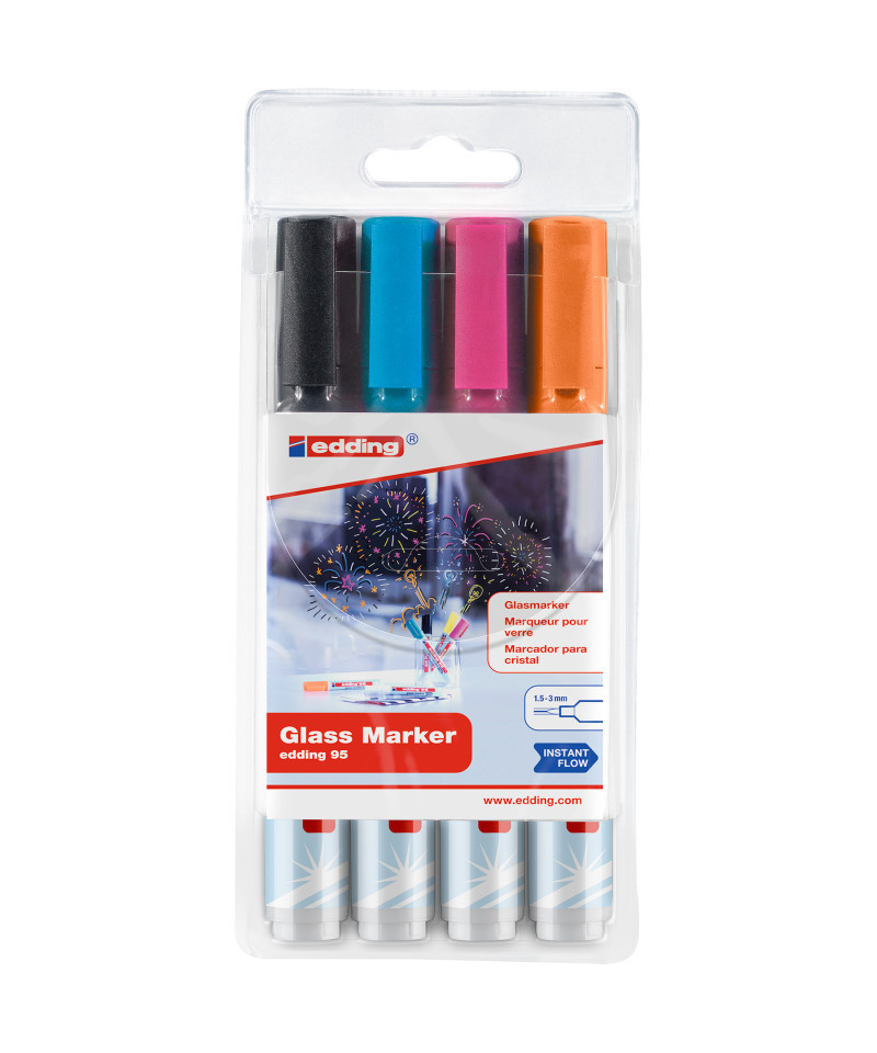 Write, draw, and decorate with brilliant color using edding 95 Series Glass Markers, Assorted Colors, Set of 4. These versatile markers feature medium bullet tips that create smooth, even lines ideal for writing, sketching, or adding flair to glass, mirrors, and other glossy surfaces. The water-based liquid ink provides vibrant, opaque color that dries quickly and can be wiped away easily with a damp cloth—perfect for classrooms, signage, and seasonal displays. The assorted 4-color set includes bright, eye-catching hues for creative variety. Low-odor and easy to use, edding 95 Series glass markers deliver excellent coverage, clarity, and control, making them a reliable choice for artists, teachers, and creative professionals.