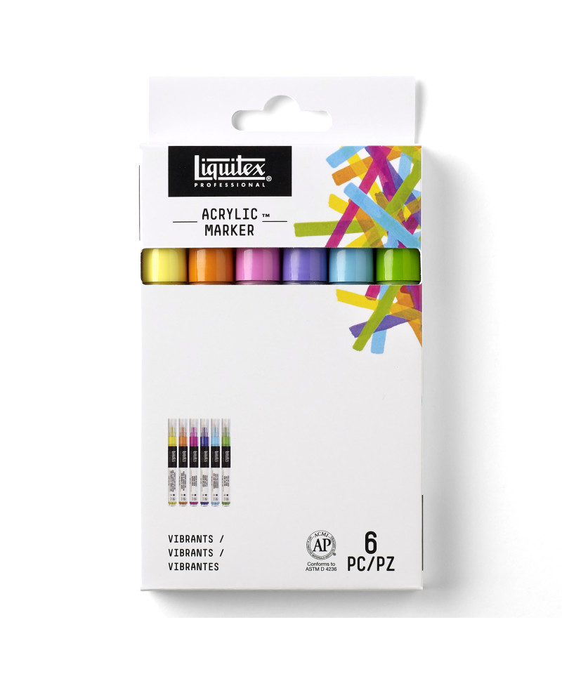 Made with highly lightfast artist-quality pigments, Acrylic Marker gives you the ultimate control, and is water-resistant when dry. This high-impact Vibrants set brings you a range of intense, vivid colors. Shake it up, pop the cap and feel inspiration flow. Enjoy the freedom to be able to create wherever, whenever, and however you want. Our pro range is all about giving you boundary-free ways to work and Acrylic Marker is a format with a difference. Each 2 mm fine art marker-style pen is filled with professional acrylic paint that’s been made with only the finest, artist quality pigments. Fast-drying, lightfast and permanent, you don't need to worry about bleeding, smudging or fade-out. Colors included: Cadmium Yellow Light Hue, Cadmium Orange Hue, Medium Magenta, Brilliant Purple, Light Blue Permanent, and Vivid Lime Green.