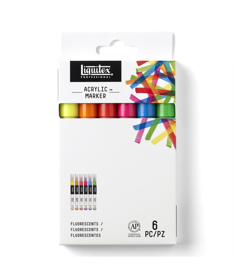 Made with artist-quality pigments, Acrylic Marker gives you the ultimate control. Add a new dimension to your palette with this fluorescent color collection, perfect for creating highlights and high-impact effects. Shake it up, pop the cap and feel inspiration flow. Enjoy the freedom to be able to create wherever, whenever, and however you want. Our pro range is all about giving you boundary-free ways to work and Acrylic Marker is a format with a difference. Each fine art marker-style pen is filled with professional acrylic paint that’s been made with only the finest, artist quality pigments. Fast-drying, lightfast and permanent, you don't need to worry about bleeding, smudging or fade-out. These vibrant marker pens will make your artwork stand out! Colors included: Fluorescent Yellow, Fluorescent Orange, Fluorescent Red, Fluorescent Blue, Fluorescent Green, and Fluorescent Pink. The Liquitex acrylic paint markers in this set have a 2 mm fine nib.