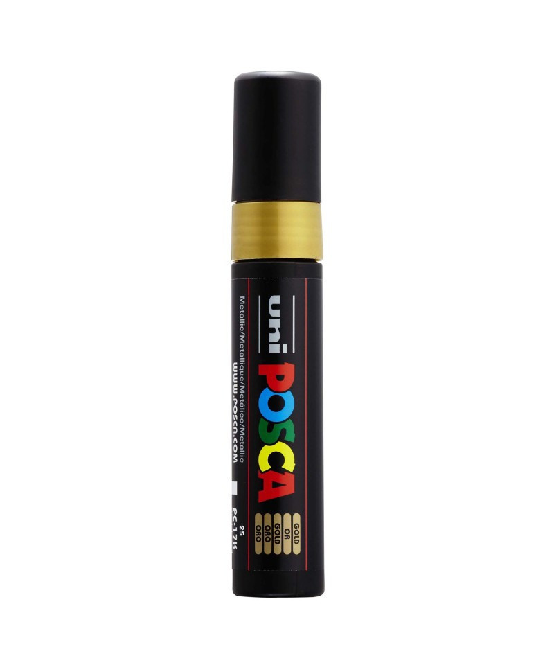 Create bold, metallic shine with the POSCA PC-17K Paint Marker, Extra Broad Tip (15 mm), Gold. This water-based paint marker delivers rich, opaque metallic coverage on a wide range of surfaces including paper, wood, canvas, plastic, metal, glass, stone, and fabric. The 15 mm chisel tip produces strong, expressive strokes ideal for posters, murals, lettering, décor projects, and large-format designs. POSCA’s smooth-flowing, quick-drying formula ensures clean application without bleed-through, while the metallic pigments provide eye-catching shimmer that remains vibrant and durable over time. The valve-controlled system offers consistent paint flow, and the tip is reversible and replaceable for extended usability. Ideal for artists, crafters, signage makers, and educators looking to create impactful metallic accents.