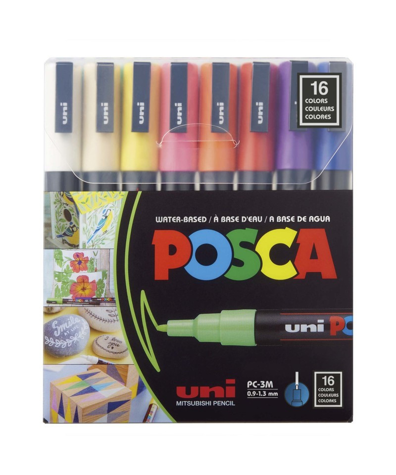 Achieve smooth, precise lines with the POSCA PC-3M Paint Markers, Fine Bullet Tip (0.9–1.3 mm), Assorted Colors, Set of 16. This versatile marker size is perfect for controlled outlining, drawing, lettering, coloring, and detailed embellishment across a wide range of creative projects. The water-based, opaque paint delivers vivid, matte coverage on paper, canvas, wood, plastic, metal, glass, ceramic, stone, and fabric, making it one of the most popular multi-surface markers used by students, artists, and makers. The fine bullet tip provides consistent, clean strokes with excellent control, ideal for both small-scale artwork and refined mixed-media work. Colors dry quickly, layer smoothly, and resist smudging or bleed-through. With a valve-controlled ink system for even paint flow and highly pigmented paint that remains vibrant over time, POSCA PC-3M markers are the go-to choice for detail-rich creative expression on any surface. Colors included: White, Yellow, Orange, Light Green, Green, Light Blue, Violet, Pink, Red, Brown, Black, Gold, Silver, Blue, Gray, Beige.