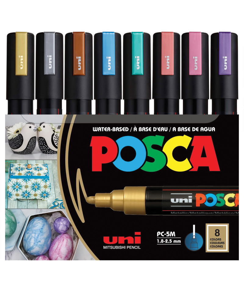 Add shimmering effects to your work with the POSCA PC-5M Paint Markers, Metallic Colors, Set of 8. These medium bullet-tip markers deliver opaque, water-based metallic paint that adheres to paper, canvas, wood, plastic, glass, metal, and more. The reversible nib ensures extended usability while maintaining crisp, consistent strokes. Perfect for accents, lettering, decorative art, crafts, and holiday projects, this set offers eye-catching shine that remains vibrant and smudge-resistant once dry. Colors Included: Gold, Silver, Bronze, Metallic Blue, Metallic Green, Metallic Red, Metallic Pink, and Metallic Violet.