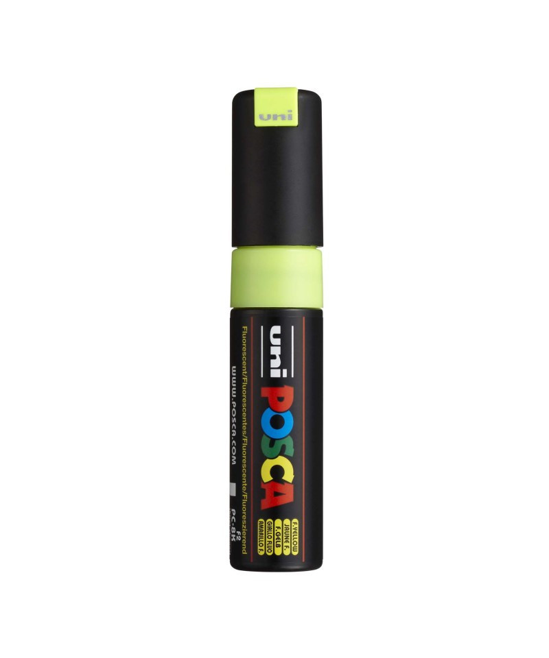 Create bold, high-impact marks with the POSCA PC-8K Paint Markers, Broad Chisel Tip (8 mm), Fluorescent Yellow. Designed for large-scale artwork, lettering, murals, and expressive mixed-media applications, these markers deliver rich, opaque color on nearly any surface, including paper, canvas, wood, plastic, metal, glass, stone, ceramic, and fabric. The 8 mm chisel tip provides dynamic line variation, offering both wide coverage and sharp, clean edges, making it ideal for posters, signage, backgrounds, and graphic illustration. POSCA’s water-based, quick-drying paint applies smoothly, dries to a matte finish, and resists smudging and fading. The valve-controlled ink system ensures consistent paint flow, and the durable tip can be reversed or replaced for extended use. Whether in the studio, classroom, or creative workspace, PC-8K markers offer reliable, vibrant performance for artists who want bold strokes and confident color.