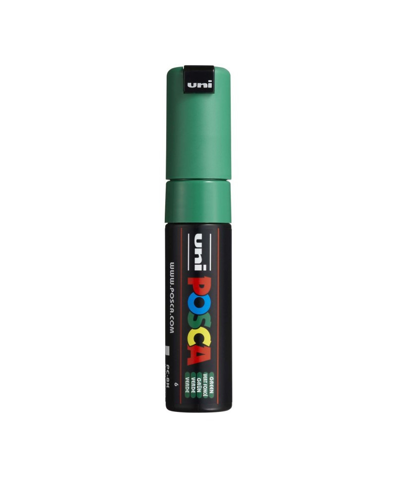 Create bold, high-impact marks with the POSCA PC-8K Paint Markers, Broad Chisel Tip (8 mm), Green. Designed for large-scale artwork, lettering, murals, and expressive mixed-media applications, these markers deliver rich, opaque color on nearly any surface, including paper, canvas, wood, plastic, metal, glass, stone, ceramic, and fabric. The 8 mm chisel tip provides dynamic line variation, offering both wide coverage and sharp, clean edges, making it ideal for posters, signage, backgrounds, and graphic illustration. POSCA’s water-based, quick-drying paint applies smoothly, dries to a matte finish, and resists smudging and fading. The valve-controlled ink system ensures consistent paint flow, and the durable tip can be reversed or replaced for extended use. Whether in the studio, classroom, or creative workspace, PC-8K markers offer reliable, vibrant performance for artists who want bold strokes and confident color.