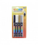 Add crisp, highly opaque details to your artwork with the DecoColor® Acrylic Paint Markers by Marvy Uchida®, Extra Fine Tip, Set of 4. This curated collection includes gold, silver, white, and black, essential colors for outlining, lettering, embellishing, and adding metallic or high-contrast accents. Each marker features an extra fine tip designed for precise, controlled application on paper, canvas, wood, plastic, metal, glass, ceramics, and other surfaces. The water-based acrylic paint flows smoothly, dries quickly to a durable, matte finish, and resists smudging and fading. Ideal for illustration, journaling, cardmaking, craft projects, and mixed-media artwork, these markers layer cleanly without bleed-through. Whether used in the classroom, studio, or at home, DecoColor® Acrylic Paint Markers provide professional-quality performance for artists and creative students who need fine, reliable lines in vibrant, opaque color.