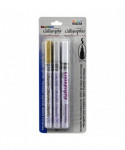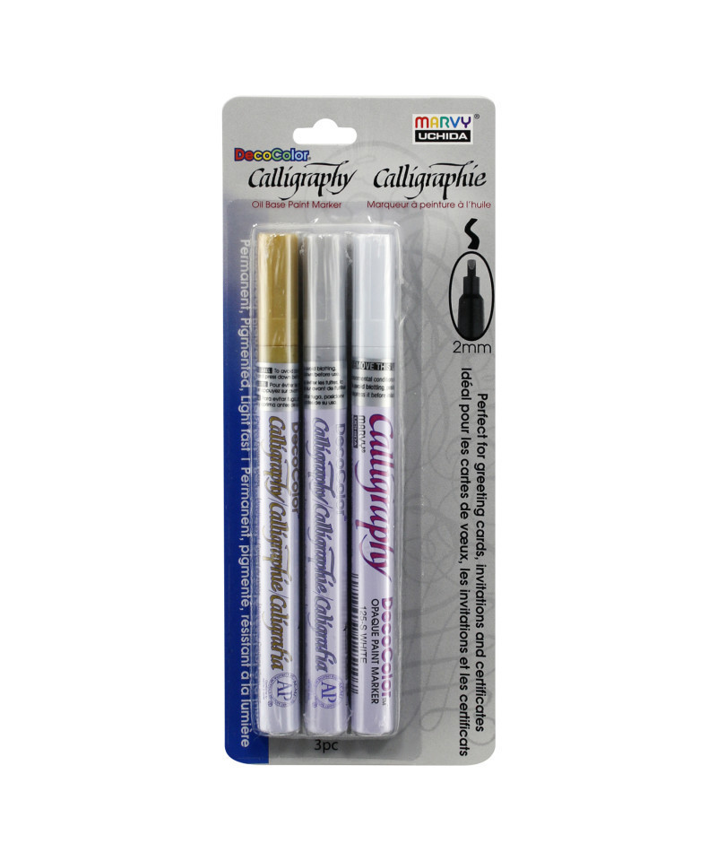 Create elegant lettering and decorative accents with the DecoColor® Calligraphy Paint Markers by Marvy Uchida®. Designed specifically for calligraphic strokes, each marker features a 2 mm flat chisel tip that produces consistent, crisp lines for titles, invitations, signage, journaling, and decorative artwork. The oil-based paint delivers smooth, opaque coverage on paper, metal, glass, wood, stone, ceramic, and other surfaces. Colors dry permanently with a rich, glossy finish that resists smudging and fading over time. These markers use an oil-based formula containing xylene, ensuring bold, durable marks ideal for long-lasting projects and professional-quality lettering. Perfect for crafters, artists, and calligraphy enthusiasts, DecoColor® Calligraphy Paint Markers offer reliable ink flow and firm tip control, making them an excellent choice for both precision detailing and expressive decorative writing on a wide range of surfaces. Contains Colors: Gold, Silver, White.