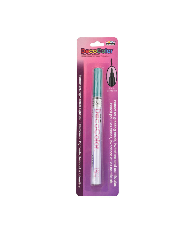 Create clean, permanent lines on a wide variety of surfaces with the DecoColor® Paint Marker, Fine Tip, 200-S, Teal by Marvy Uchida®. This versatile marker features a fine point that delivers smooth, controlled application ideal for labeling, outlining, detailing, and decorative artwork. The oil-based, pigmented ink provides strong opacity, dries permanently, and remains lightfast for long-lasting color. It is acid free, weatherproof, and designed to cover most non-coated surfaces including glass, clay, wood, stone, porcelain, mirrors, metal, and paper. The durable formula includes xylene for enhanced adhesion and performance, making it suitable for indoor and outdoor projects where permanence is essential. Users should test the marker on an inconspicuous area first, as results may vary depending on surface type, finish, climate, and material composition. DecoColor® Fine Tip Paint Markers are ideal for artists, hobbyists, and makers who need crisp, reliable, permanent marks across multiple hard surfaces.