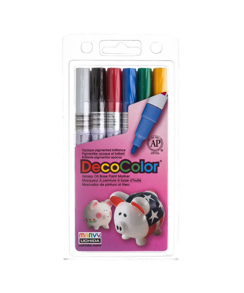 Create clean, permanent lines on a wide variety of surfaces with this DecoColor® Paint Marker, Fine Tip, 200-S, Primary Color Set of 6 by Marvy Uchida®. These versatile markers feature a fine point that delivers smooth, controlled application ideal for labeling, outlining, detailing, and decorative artwork. The oil-based, pigmented ink provides strong opacity, dries permanently, and remains lightfast for long-lasting color. It is acid free, weatherproof, and designed to cover most non-coated surfaces including glass, clay, wood, stone, porcelain, mirrors, metal, and paper. The durable formula includes xylene for enhanced adhesion and performance, making it suitable for indoor and outdoor projects where permanence is essential. Users should test the marker on an inconspicuous area first, as results may vary depending on surface type, finish, climate, and material composition. DecoColor® Fine Tip Paint Markers are ideal for artists, hobbyists, and makers who need crisp, reliable, permanent marks across multiple hard surfaces.