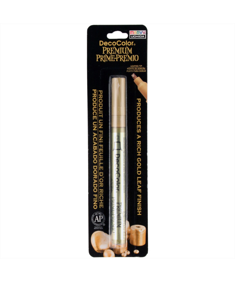 Create rich metallic accents with the DecoColor® Premium Paint Marker by Marvy Uchida®, Leafing Tip, 250-S. Designed for decorative detail work, this marker features a specialized 2 mm leafing tip that delivers smooth, controlled application of opaque metallic color. Available in Copper, Gold, and Silver, the pigmented oil-based formula provides brilliant, permanent coverage on paper, wood, metal, glass, clay, stone, plastic, and other prepared surfaces. The ink is acid free, non-toxic, lightfast, and highly opaque, making it ideal for lettering, embellishments, craft projects, signage, and decorative artwork that require clean, durable metallic sheen. The paint dries to a permanent finish that resists fading and smudging over time. Perfect for studio, classroom, and home use, DecoColor® Premium Paint Markers offer professional-quality results for artists and creators seeking precise metallic detail and long-lasting surface adhesion.