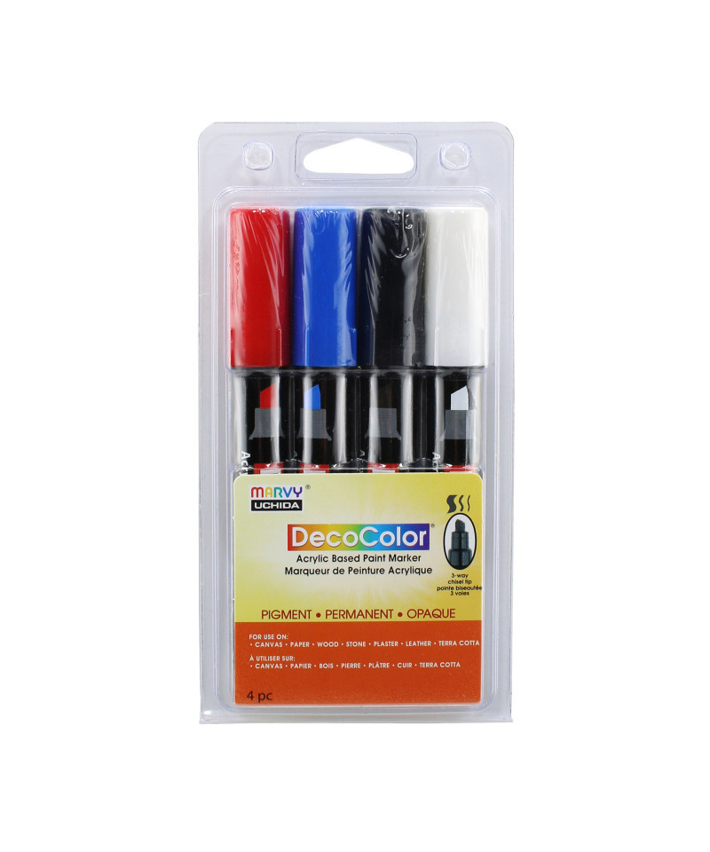 Create bold, versatile strokes with the DecoColor® Acrylic Paint Markers, Chisel Tip, Basic Colors Set of 4 by Marvy Uchida®. Designed for smooth application on a wide range of craft and art surfaces, this marker features a 3-way chisel tip that allows artists to produce broad strokes, thin lines, and precise angled marks with a single tool. The opaque, pigmented acrylic paint is acid free, non-toxic, and permanent when dry, making it ideal for both indoor and outdoor projects. It works beautifully on wood, plaster, foam, walls, paper, terra cotta, and other porous or semi-porous surfaces. These markers are an excellent choice for school projects, decorative outdoor crafts like painted flower pots and benches, signage, and general arts-and-crafts creativity. Easy to control and reliable in coverage, the DecoColor® Acrylic Chisel Tip Marker offers strong color payoff and durable performance for students, hobbyists, and creative makers. Colors included: black, white, red, blue.
