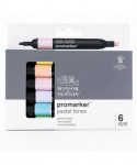 Create soft, delicate artwork with the Winsor & Newton Promarker™ Pastel Tones, Set of 6, a curated palette of gentle hues perfect for subtle shading, smooth transitions, and light, airy color work. This set includes Soft Peach, Buttercup, Meadow Green, Cool Aqua, Lavender, and Pale Pink, six essential pastels ideal for illustrating portraits, florals, fashion design, landscapes, and stylized character work.