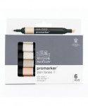 Achieve smooth, natural complexion shades with the Winsor & Newton Promarker™ Skin Tones 1, Set of 6, a foundational palette designed for portrait work, character design, fashion illustration, and figure studies. This carefully selected assortment includes Ivory, Satin, Almond, Putty, Coral, and Soft Pea, offering a versatile range of light and mid-tone skin colors ideal for building realistic depth, blending shadows, and creating dimensional highlights.