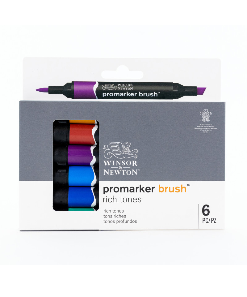 Explore depth, drama, and expressive contrast with the Winsor & Newton Promarker™ Brush, Rich Tones, Set of 6. Designed for artists who want bold color impact and dynamic shading capability, this set includes Amber, Firebrick, Plum, Azure, Egyptian Blue, and Ocean Teal, giving you a powerful mix of warm, cool, and jewel-inspired hues ideal for concept art, illustration, character design, and mixed-media compositions.
