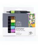 Create vibrant, imaginative characters and magical worlds with the Winsor & Newton Promarker™ Manga Fantasy, Set of 12+1. This specialized palette includes 12 Promarkers™ plus one Blender, offering a rich combination of warm skin tones, vivid accents, soft pastels, and deep fantasy hues chosen to support stylized illustration, anime artwork, and fantasy character design. The set includes Cocoa, Tan, Buttercup, Leaf Green, Forest Green, Arctic Blue, Duck Egg, Purple, Fuchsia Pink, Baby Pink, Almond, and Sun Kissed Pink, giving artists a wide range of colors for hair, costumes, magical elements, and expressive character shading.