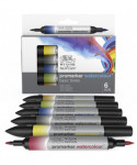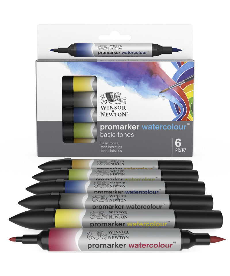 Create beautiful watercolor effects with the ease and control of a marker using the Winsor & Newton Promarker™ Watercolor, Basic Tones, Set of 6. Designed for artists who love expressive color with minimal setup, this set includes Alizarin Crimson Hue, Cadmium Yellow Hue, Ivory Black, Prussian Blue Hue, Sap Green, and Yellow Ochre, a foundational palette that supports mixing, layering, and traditional watercolor techniques.