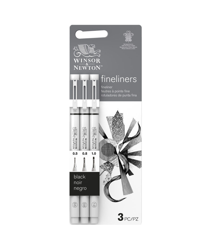 Achieve bold outlines, expressive line weight, and clean, professional detail with the Winsor & Newton Fineliner Pens, Black, Assorted Sizes (0.5, 0.8, 1.0 mm), Set of 3. Designed for artists, illustrators, designers, and creatives who rely on strong, confident lines, this set offers three essential tip sizes ideal for outlining, shadowing, sketching, lettering, and mixed-media work.