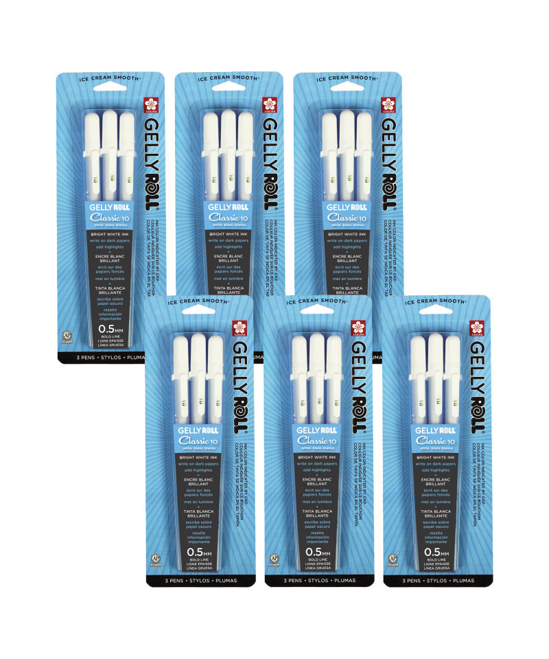 Sakura has perfected the smooth ink flow technology of Gelly roll classic White. The opaque White ink stands out on dark and colored papers and makes highlights pop in illustrations and Comics. Use it for hand lettering, accents party crafts, layered on top of colors for mixed media and bright highlights in tonal drawings. Elevate your writing and drawing to another level using the range of thick and thin lines, small detail and unique bold marks. Each pack contains 3 Gelly roll White classic 10 (bold point) pens. Sold as 6 packs.