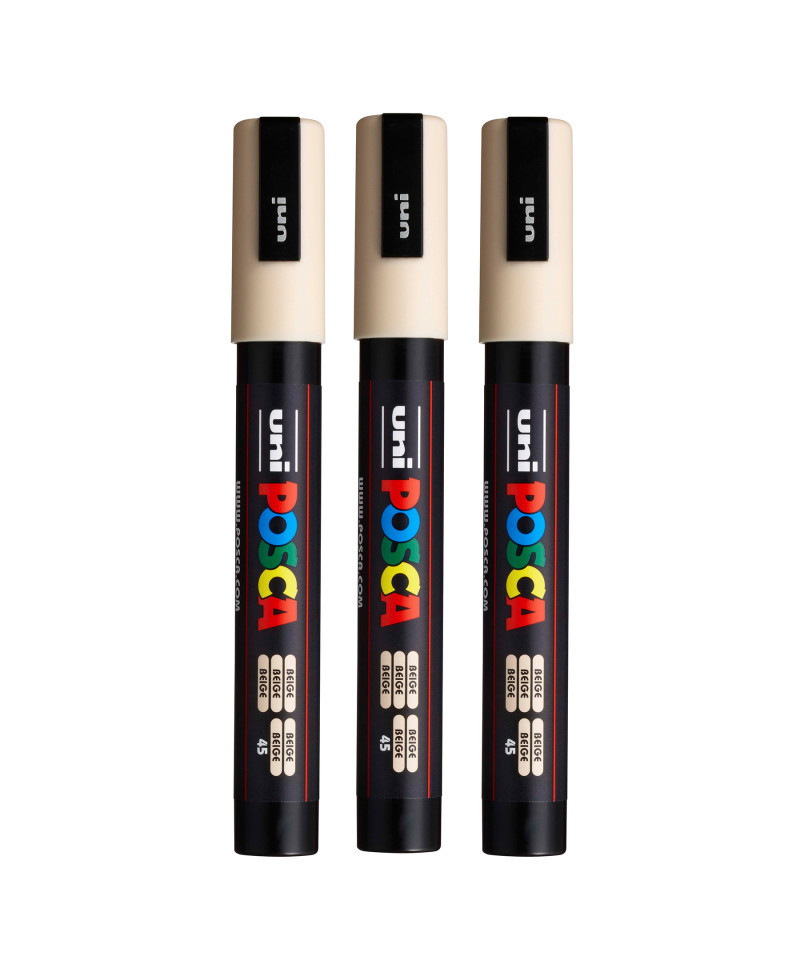 Create bold, vibrant artwork with the POSCA PC-5M Paint Marker, Reversible Medium Bullet Tip (1.8–2.5 mm), Beige. This versatile paint marker is designed for smooth, even coverage on a wide range of surfaces, including paper, canvas, wood, metal, plastic, glass, ceramic, fabric, and stone. The medium bullet tip offers excellent control and flexibility, fine enough for outlining and lettering, yet broad enough for coloring, shading, and larger areas. The highly opaque, water-based paint applies cleanly, dries quickly to a matte finish, and resists smudging, bleeding, and fading. POSCA’s reversible tip can be removed, flipped, or replaced to extend the life of each marker. Ideal for illustration, mixed media, journaling, craft projects, customization, and classroom use, the PC-5M marker is one of POSCA’s most popular sizes for artists and students who need reliable, multi-surface performance. Sold as a pack of 3.