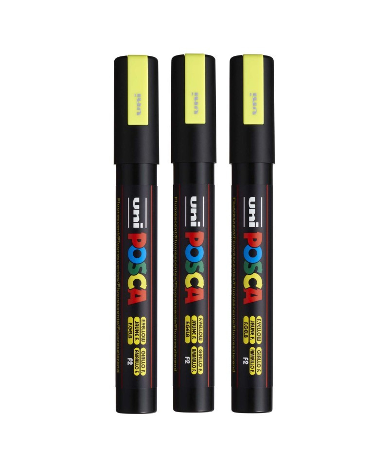 Create bold, vibrant artwork with the POSCA PC-5M Paint Marker, Reversible Medium Bullet Tip (1.8–2.5 mm), Fluorescent Yellow. This versatile paint marker is designed for smooth, even coverage on a wide range of surfaces, including paper, canvas, wood, metal, plastic, glass, ceramic, fabric, and stone. The medium bullet tip offers excellent control and flexibility, fine enough for outlining and lettering, yet broad enough for coloring, shading, and larger areas. The highly opaque, water-based paint applies cleanly, dries quickly to a matte finish, and resists smudging, bleeding, and fading. POSCA’s reversible tip can be removed, flipped, or replaced to extend the life of each marker. Ideal for illustration, mixed media, journaling, craft projects, customization, and classroom use, the PC-5M marker is one of POSCA’s most popular sizes for artists and students who need reliable, multi-surface performance. Sold as a pack of 3.