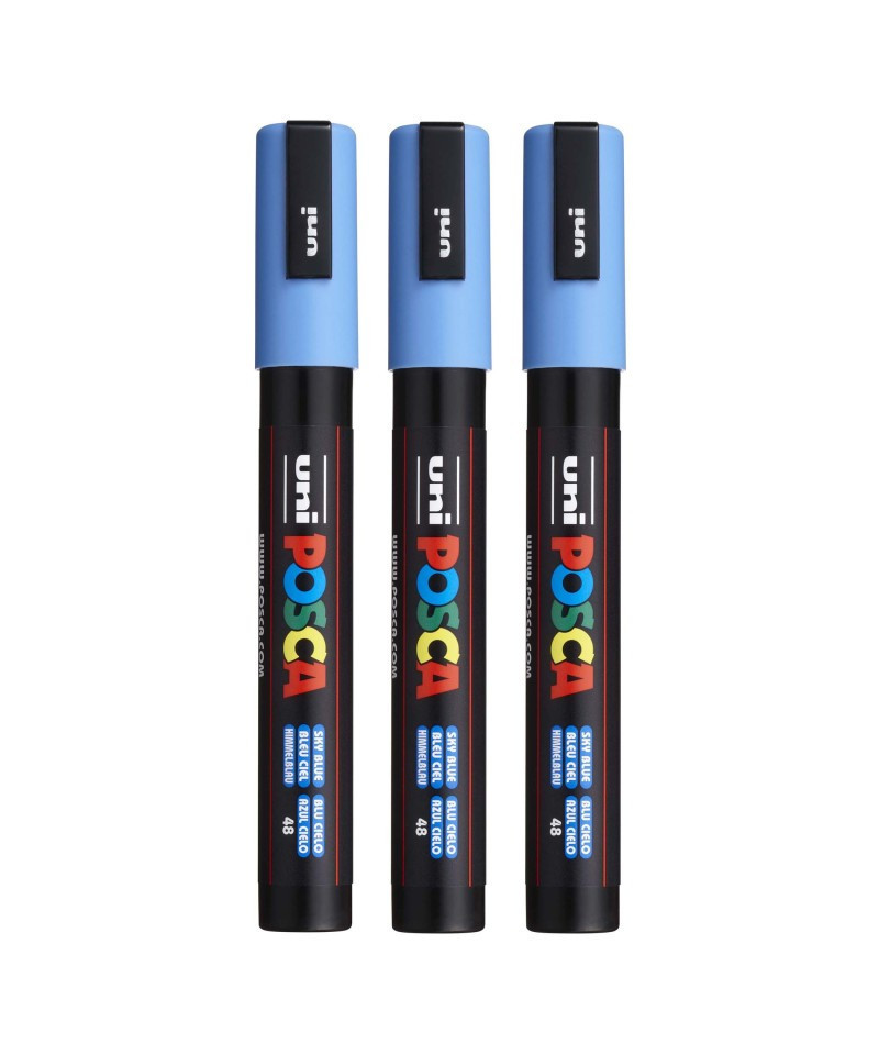 Create bold, vibrant artwork with the POSCA PC-5M Paint Marker, Reversible Medium Bullet Tip (1.8–2.5 mm), Sky Blue. This versatile paint marker is designed for smooth, even coverage on a wide range of surfaces, including paper, canvas, wood, metal, plastic, glass, ceramic, fabric, and stone. The medium bullet tip offers excellent control and flexibility, fine enough for outlining and lettering, yet broad enough for coloring, shading, and larger areas. The highly opaque, water-based paint applies cleanly, dries quickly to a matte finish, and resists smudging, bleeding, and fading. POSCA’s reversible tip can be removed, flipped, or replaced to extend the life of each marker. Ideal for illustration, mixed media, journaling, craft projects, customization, and classroom use, the PC-5M marker is one of POSCA’s most popular sizes for artists and students who need reliable, multi-surface performance. Sold as a pack of 3.